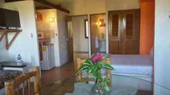 1 cama King size, 2 camas individuales, y 2 sofá cama, capacidad máxima 6 adultos. Cuenta con cocina equipada con estufa, microondas, refrigerador y loza. Aire acondicionado, televisión y amenidades en el cuarto de baño.